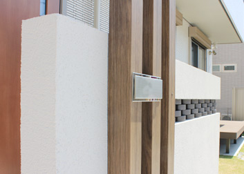 門柱にはジョリパット塗りを施し、アプローチにはフォレストペイギングオールドを使用することで、訪れる人々を温かく迎え入れる空間を演出しています。