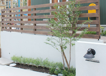 庭にはエコアコールウッドのフェンスが設置され、プライバシーを守りつつ、自然な風合いを演出。