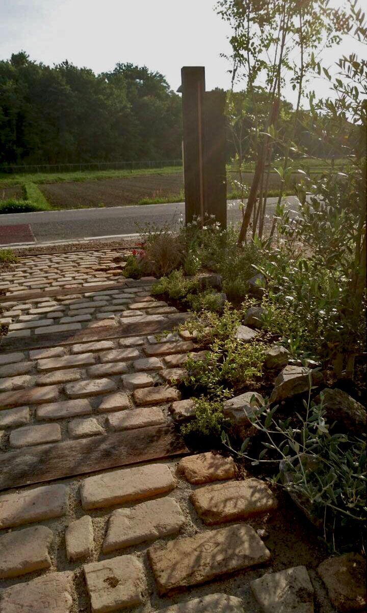 アプローチにはアンティークレンガと枕木を用い、タイムが香る小道を演出。