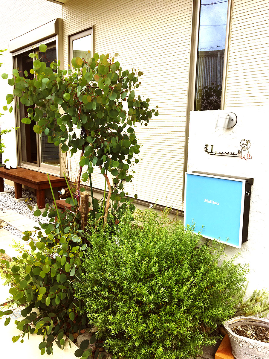 アプローチからの全体的な雰囲気がとても気に入っています。オリジナルで作ってもらったステンレスの表札はとても好評でお気に入りです。
