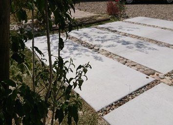 使用した材料にもこだわりがあります。コンクリートとコブルを組み合わせたアプローチは、モダンでありながら自然の風合いを感じさせるデザインです。